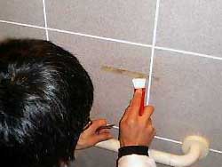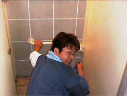 世話人の松村さんです。 「はがします」を使い、タイルののりを取っ ています。 |