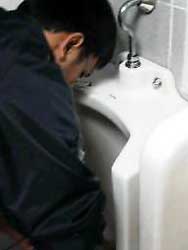 石間さんが笑顔で小便器を磨いています。 |