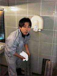 世話人の山北さんです。 小便器を磨いた後に、 大便器を丁寧に磨かれています。 |