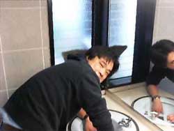 世話人の村井さんです。 まじめに洗面所を磨いています。 |