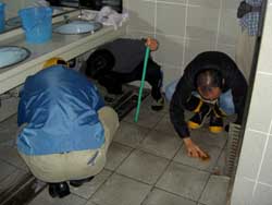 排水溝の掃除様子。 左写真は、男子トイレ担当の松村さん。 右写真は、女子トイレ担当の伊井さん。 |