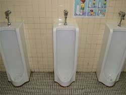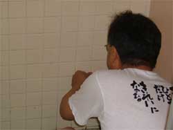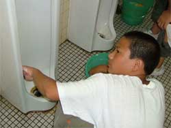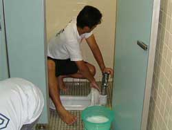 | 女子トイレの 便器磨きをした後に、 男子トイレの 便器磨きをしました。 かなり大変な 掃除体験となりましたが、 精一杯に取り組む 児童と先生。 |