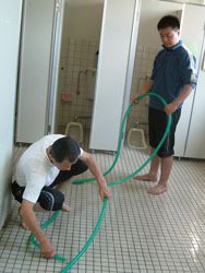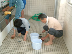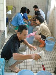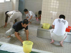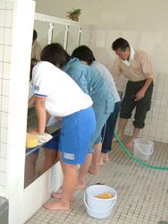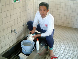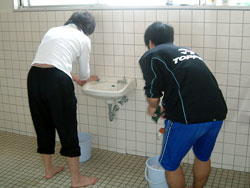 バケツで道具を 順番に洗い、 最後の人は 道具をふきあげて まとめます。 ↓↓↓ |
