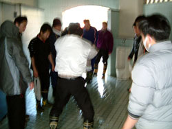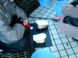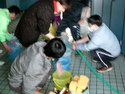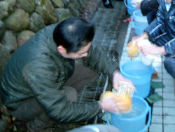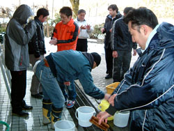 | ↑↑↑外では、若鯖塾3期生が水こしに挑戦。↑↑↑ 寒い中、ひとつひとつ丁寧に汚れを落としていました。 |