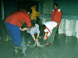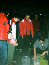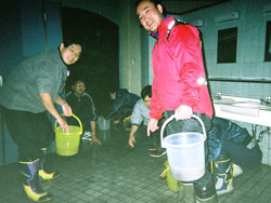 床の後は、 道具を洗います。 →→→→→ 順番にバケツを並べて、 水を無駄にしないように 洗っていきます。 |