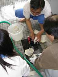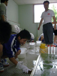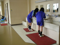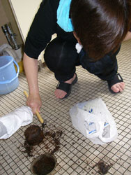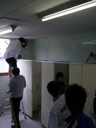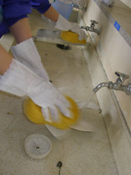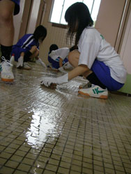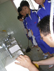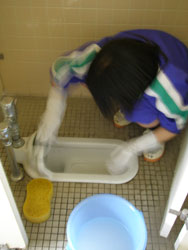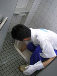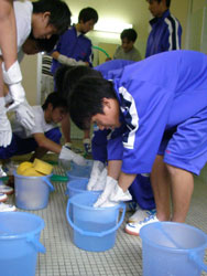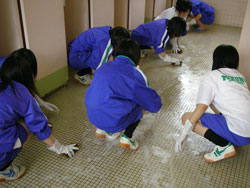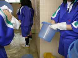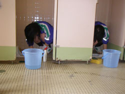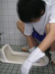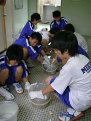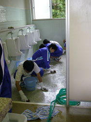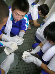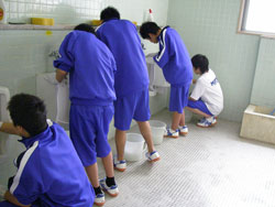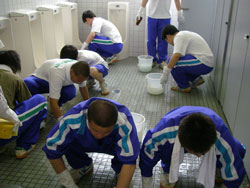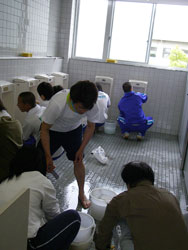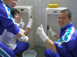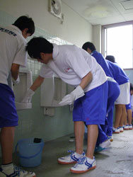 | 小便器の掃除指導。 初めは「まじかよ〜。」って思っていた生徒も 途中から真剣に磨いてます。 だんだん楽しくなってきたようです。 |