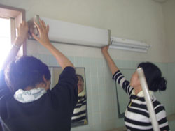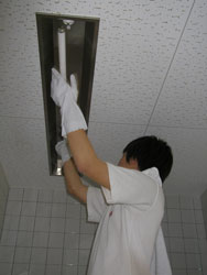 | 掃除の基本は上から。 上掃き掃除に照明の掃除。 |